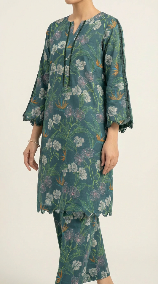 Elegant Floral Printed 2-Piece Co-Ord Set – Teal Green – Dhagakari Sukoon Collection