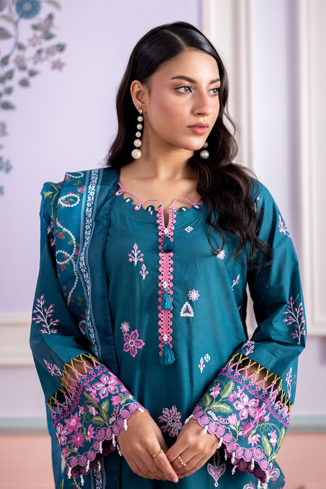 DYED EMBROIDERED LAWN SHIRT - PASTE PRINTED DENTING LAWN DUPATTA - PASTE PRINTED CAMBRIC TROUSER