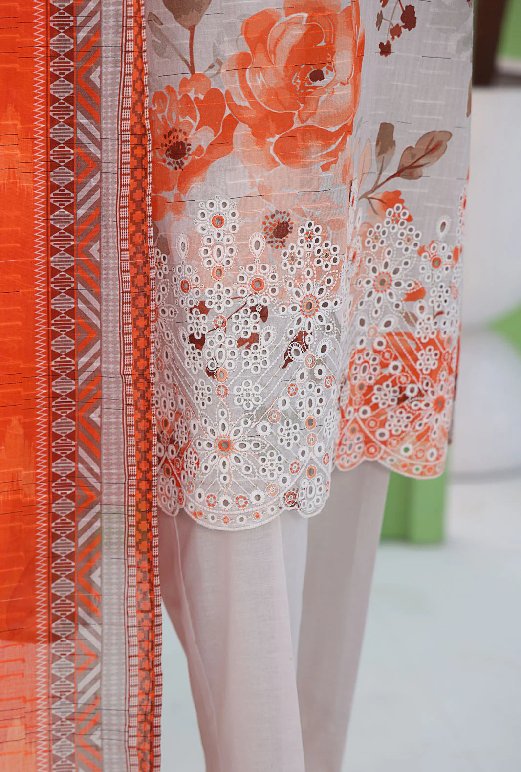 The outfit features a digital printed embroidered fancy doriya shirt paired with a vibrant printed fancy doriya dupatta that adds a touch of elegance and flair. A dyed cambric trouser completes the set, giving you a complete look that you can tailor to your personal taste.